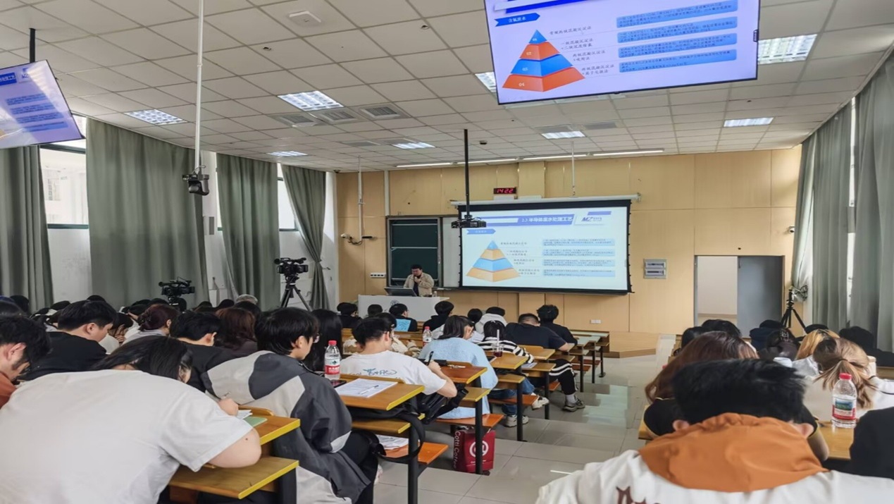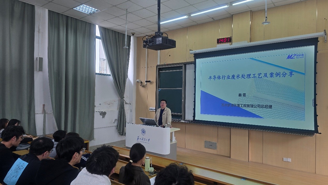为持续推进产教融合、校企协同育人,4月15日下午,环境学院邀请苏州梦泽环境工程有限公司总经理、学院优秀校友聂青走进课堂,在石湖校区C5-203为环境工程专业23级学生带来题为《半导体行业废水处理工艺及案例分享》的专题授课,环工系师生共百余人参加本次活动。