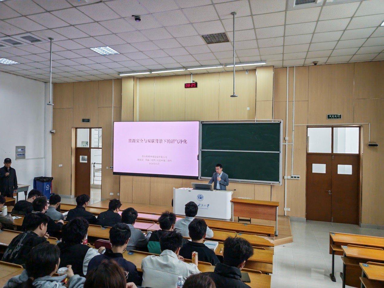 为持续推进产教融合、校企协同育人,4月21日上午,环境学院邀请苏州科特环保股份有限公司技术总监、学院优秀校友杨海亮高级工程师走进《大气污染控制工程》课程,在石湖校区C5-201为环境工程专业23级的百余学生带来题为《能源安全与双碳背景下的沼气净化技术》的专题授课。