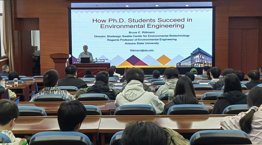 交流,并在环境学院二楼报告厅作了题为《How Ph.D. Students Succeed in Environmental Engineering》的学术讲座。本次讲座由环境学院党委书记潘杨主持,学院青年教师、研究生等百余名师生到场学习。